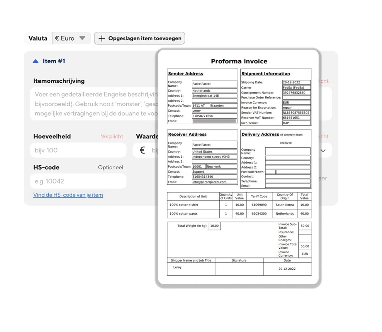 Als je via ParcelParcel verzendt buiten de EU, hoef je je over deze verandering geen zorgen te maken. Wij genereren de douanedocumenten automatisch bij elke zending. Facturen, paklijsten, HS-codes — alles wordt voor je aangemaakt en correct ingevuld.